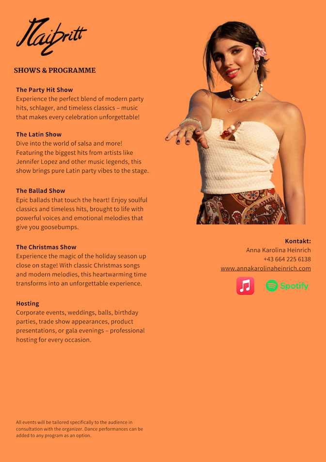 At just 21 years old, Maibritt is on the verge of taking over big stages. She’s already recognized as a talented songwriter, having released twenty original songs. Her single *Baila Conmigo* was especially successful, airing on more than 70 radio stations in German-speaking countries, including ORF.